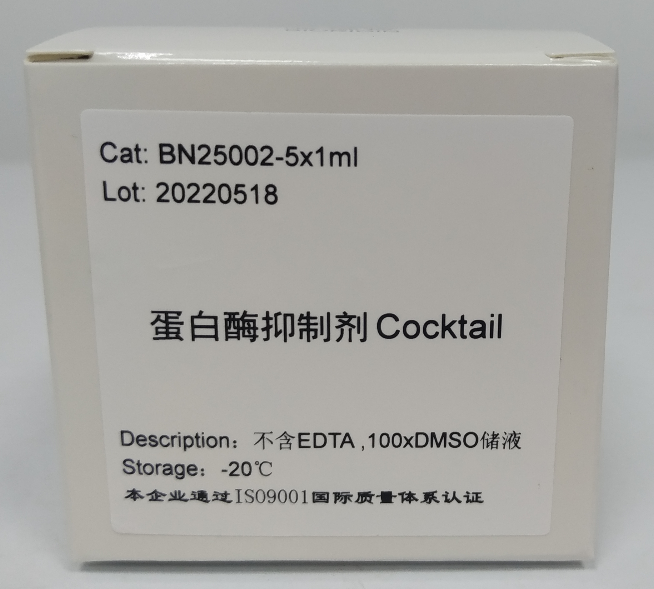 1. 本產(chǎn)品不含 EDTA,為 100×DMSO 儲(chǔ)存液形式。使用時(shí)應(yīng)調(diào)整 Cocktail 濃度為 1×,若有蛋白酶含量豐富的細(xì)胞或組織,可適當(dāng)增加 Cocktail 在實(shí)驗(yàn)體系中的濃度。